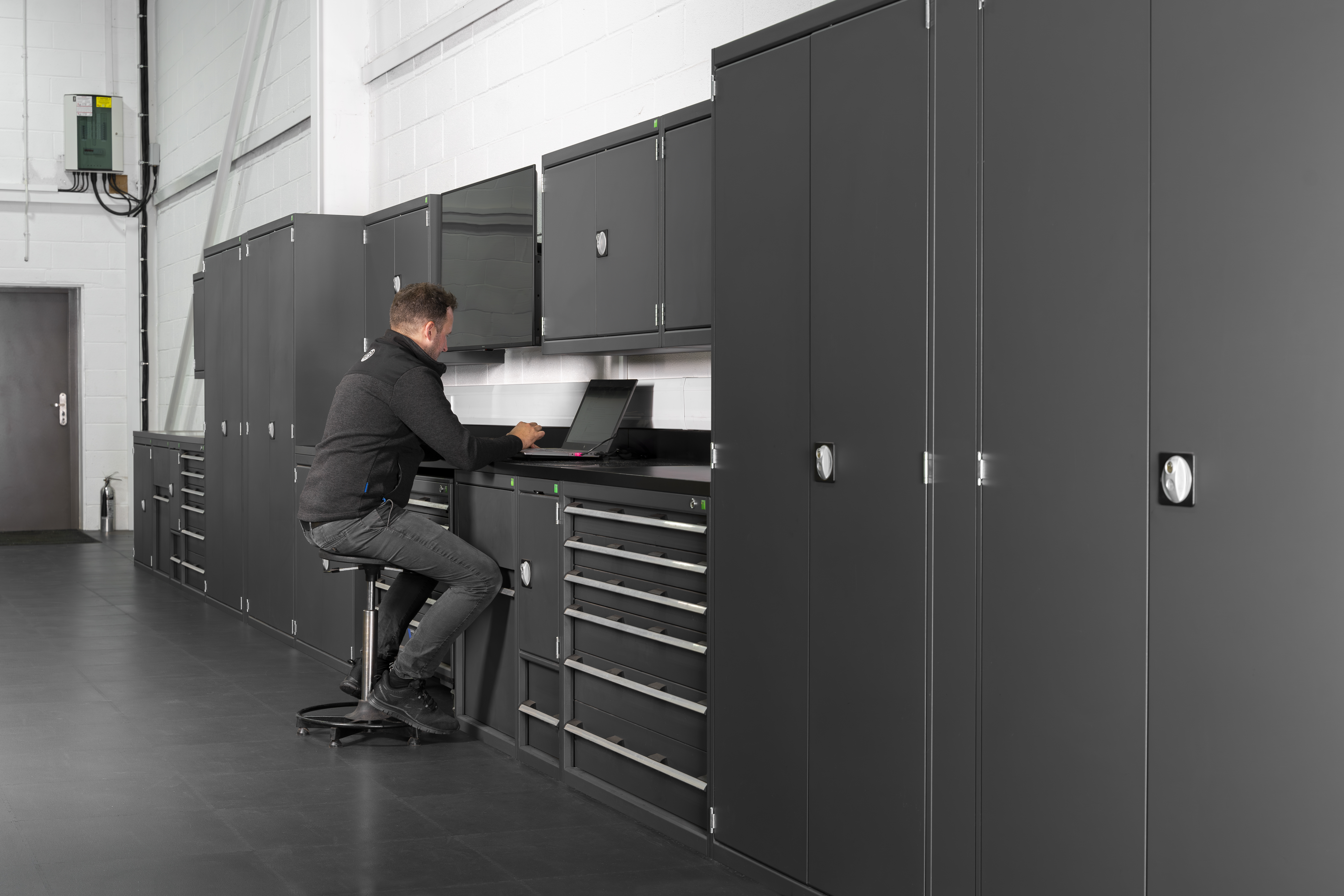 Our modular workshop storage equipment has been used to configure individual work areas, enabling each engineering technician to have their tools organised and stored by preference. The ergonomic workstations consist of large storage cupboards, wall-mounted cupboards, heavy duty cabinets and made-to-measure mobile cabinets. Also integrated into the workplace system is a computer, vice unit and bott bins.
